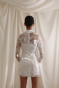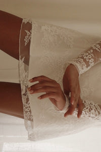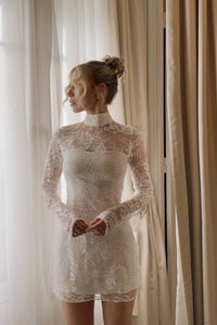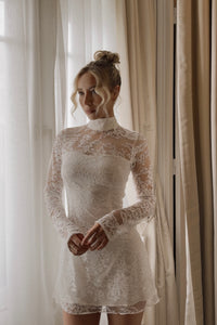 Featuring a structured lace silhouette, sculpted long sleeves, and a finish that feels tailored yet effortless. Lilou is the statement mini for a new era of bridal dressing.
