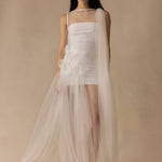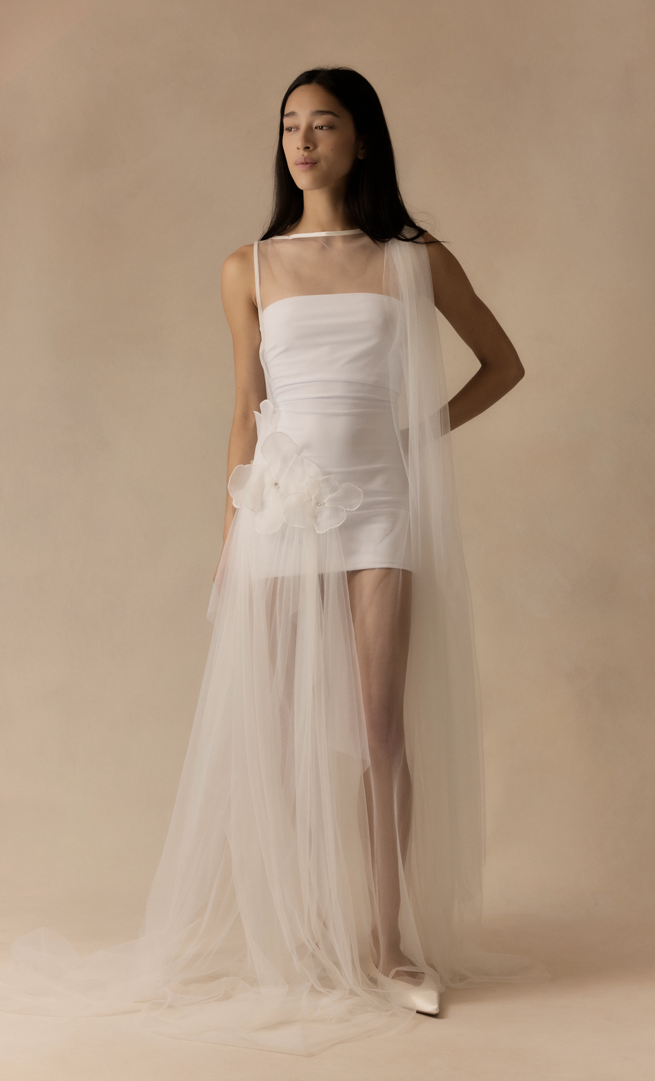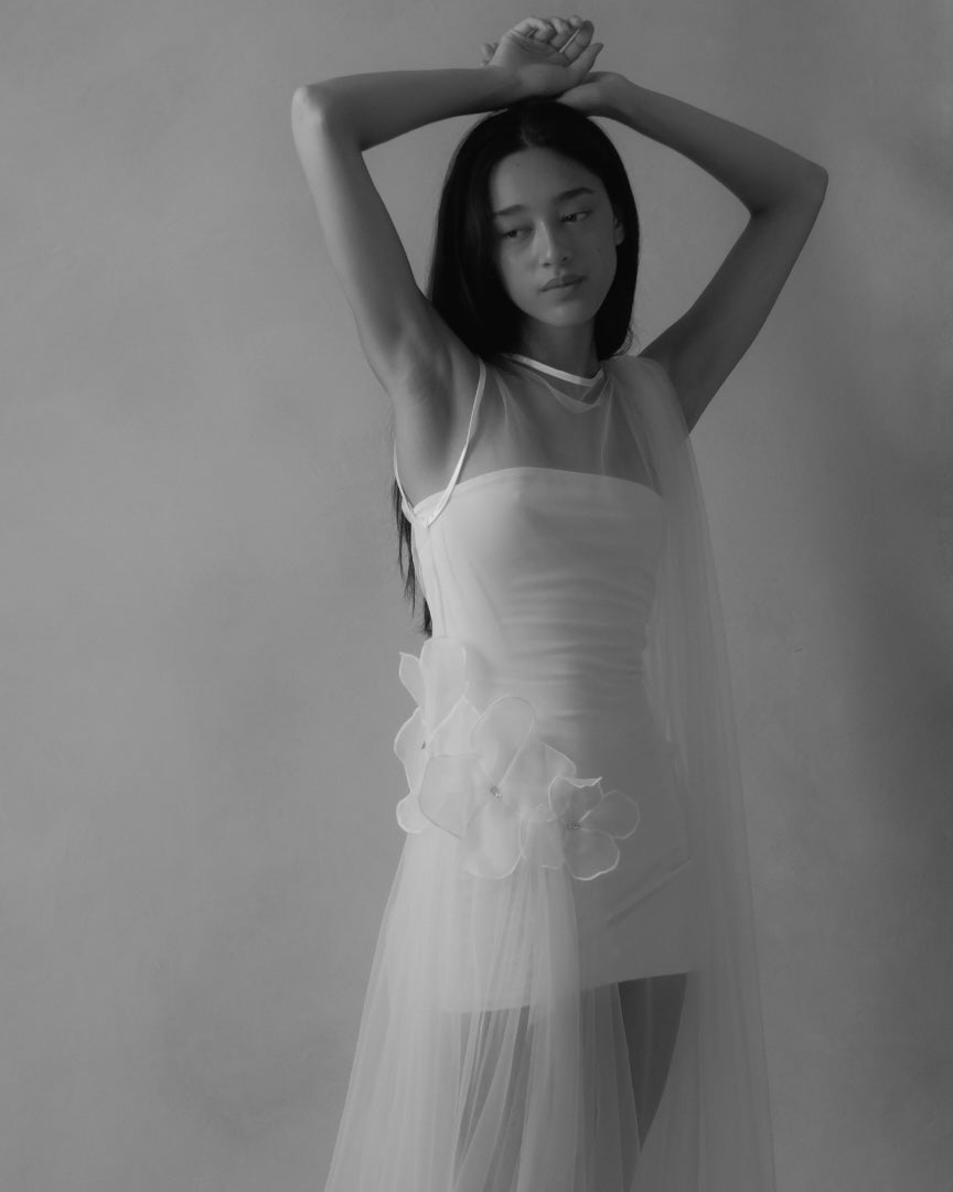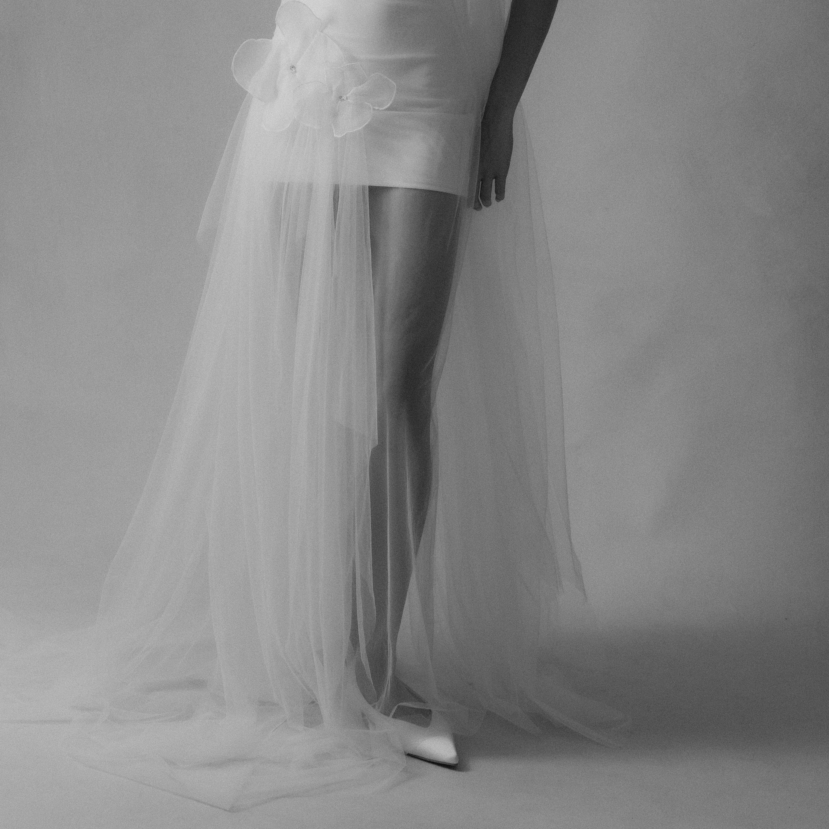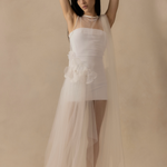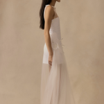 An outer tulle layer sits over a detachable internal slip, allowing the look to be styled in different ways. The shape follows the body with a soft, fluid fall. Both pieces are sold together.