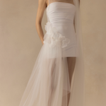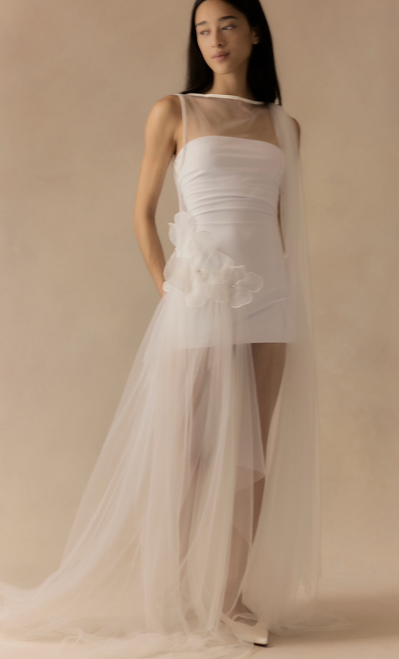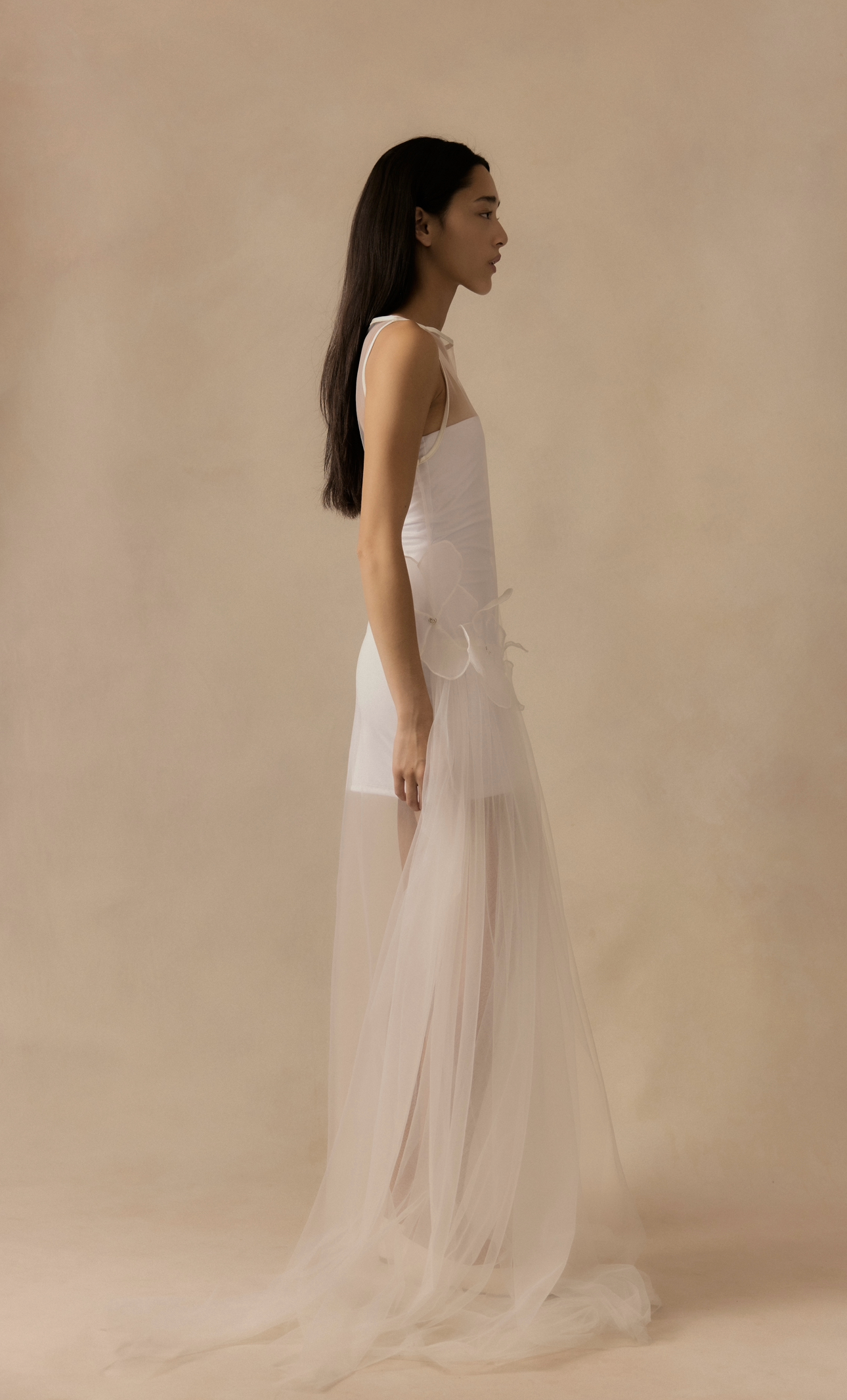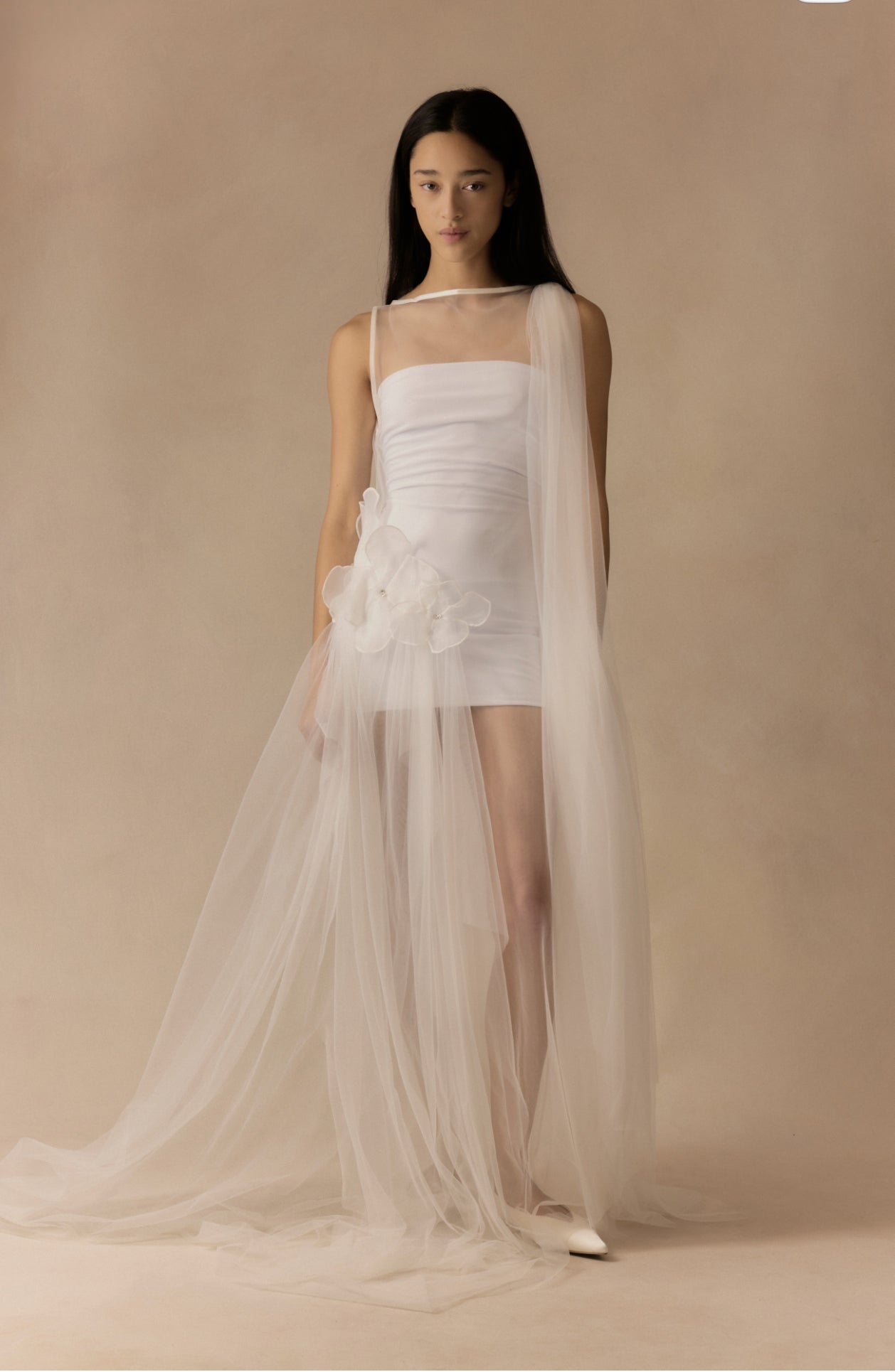 An outer tulle layer sits over a detachable internal slip, allowing the look to be styled in different ways. The shape follows the body with a soft, fluid fall. Both pieces are sold together.