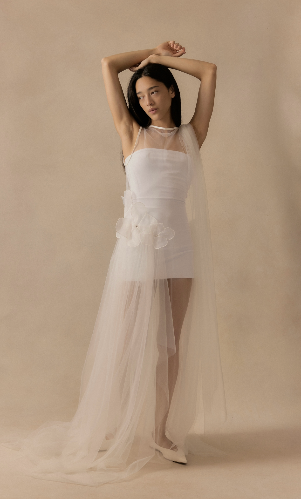 Kaia features sheer asymmetric tulle draping with two shoulder trains and hand-stitched floral appliqué detailing.