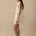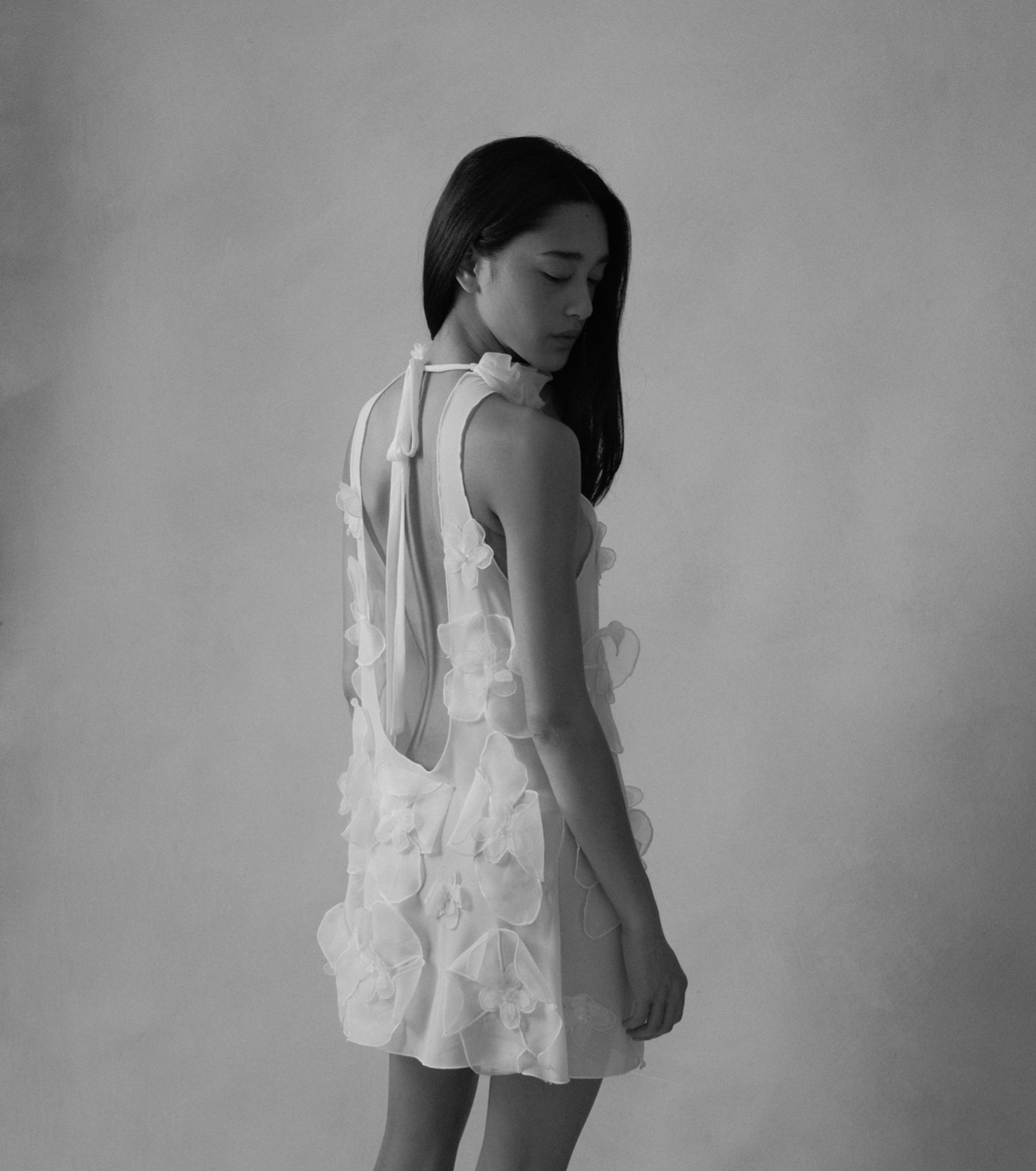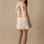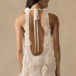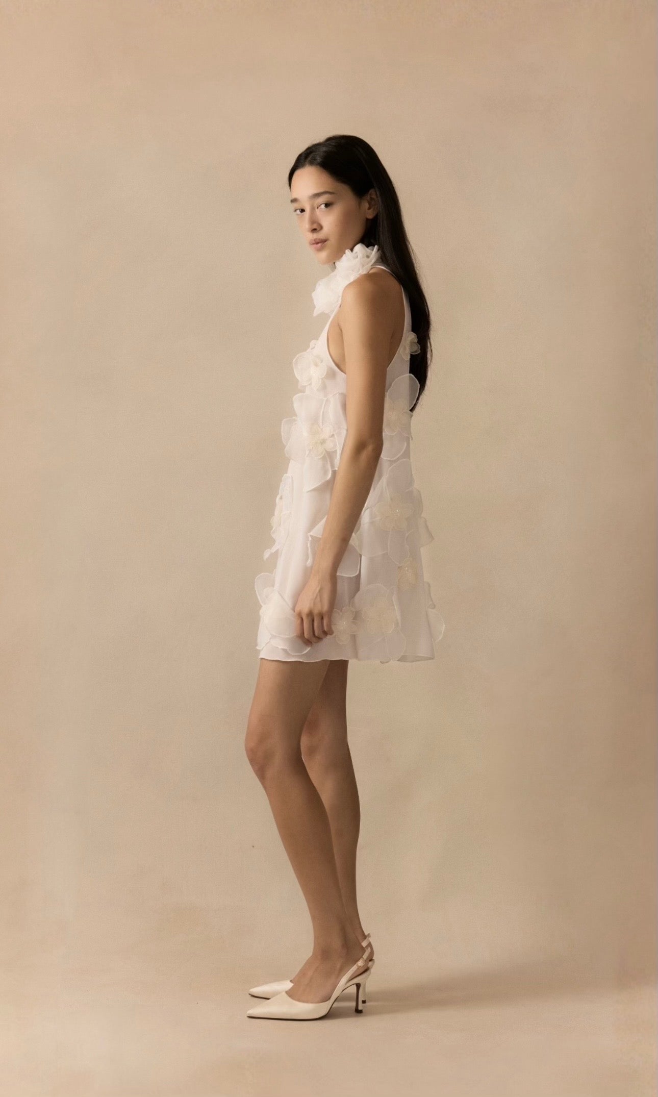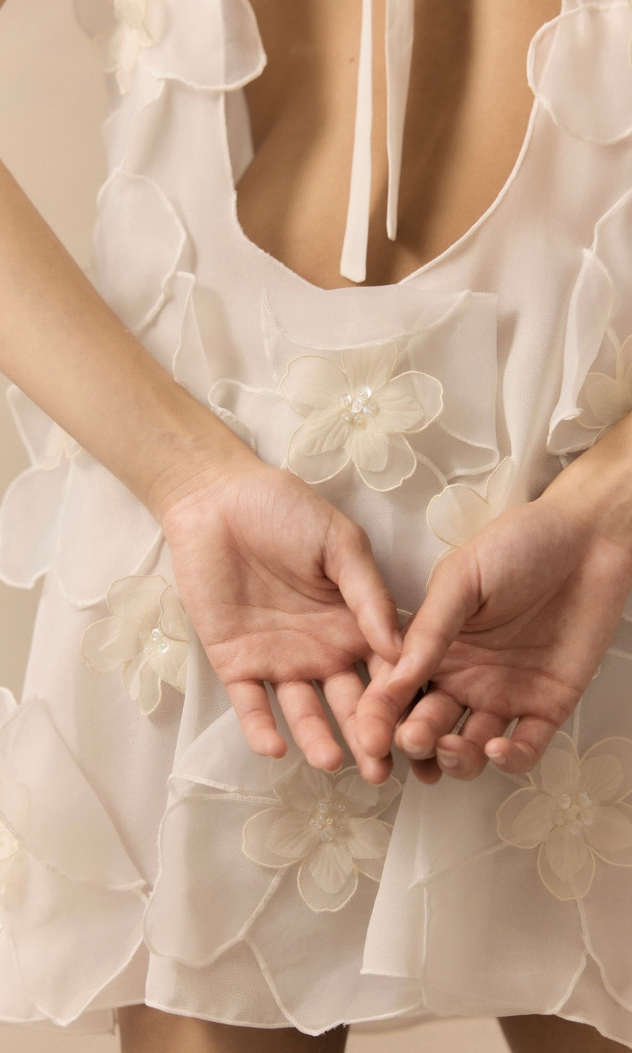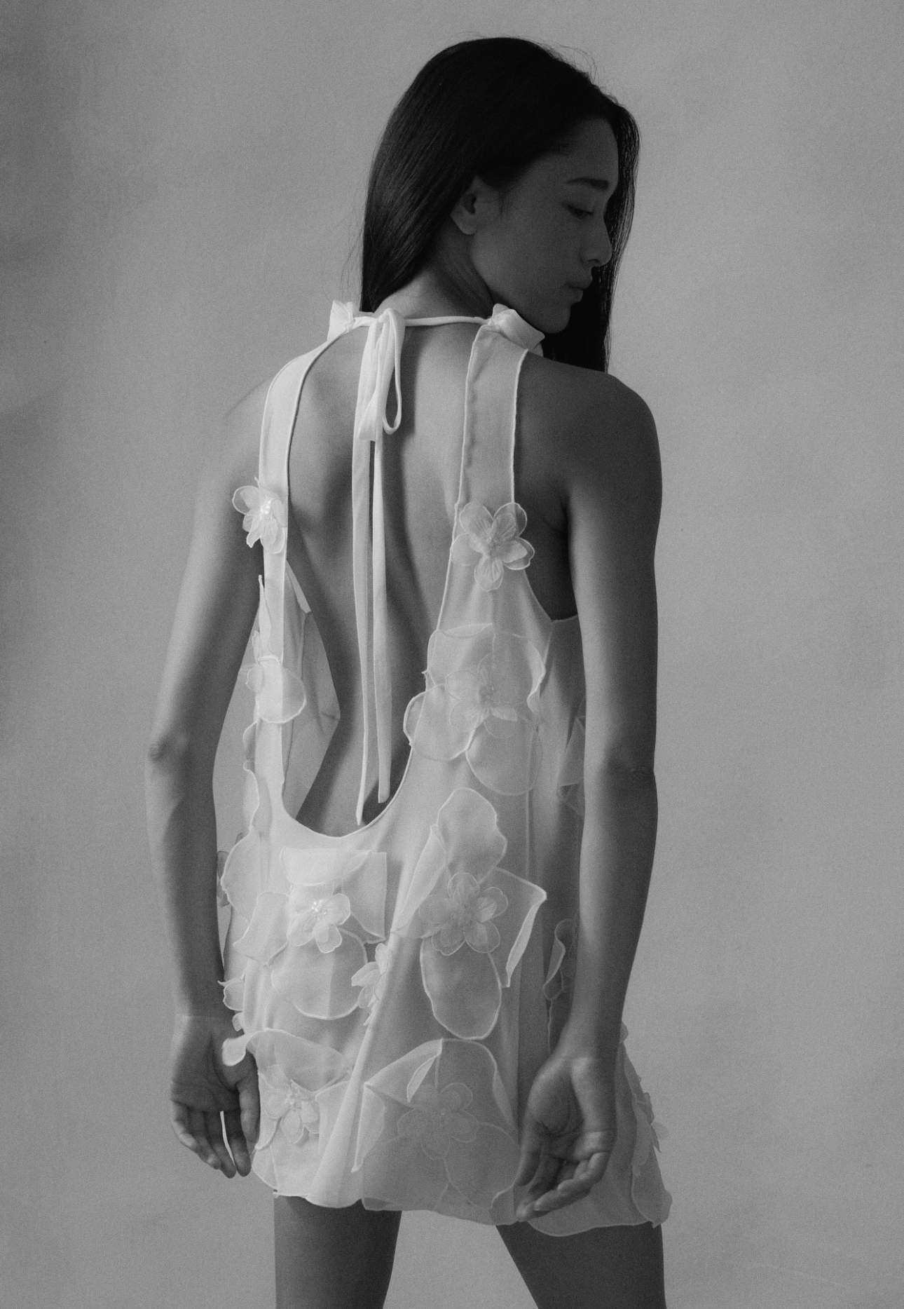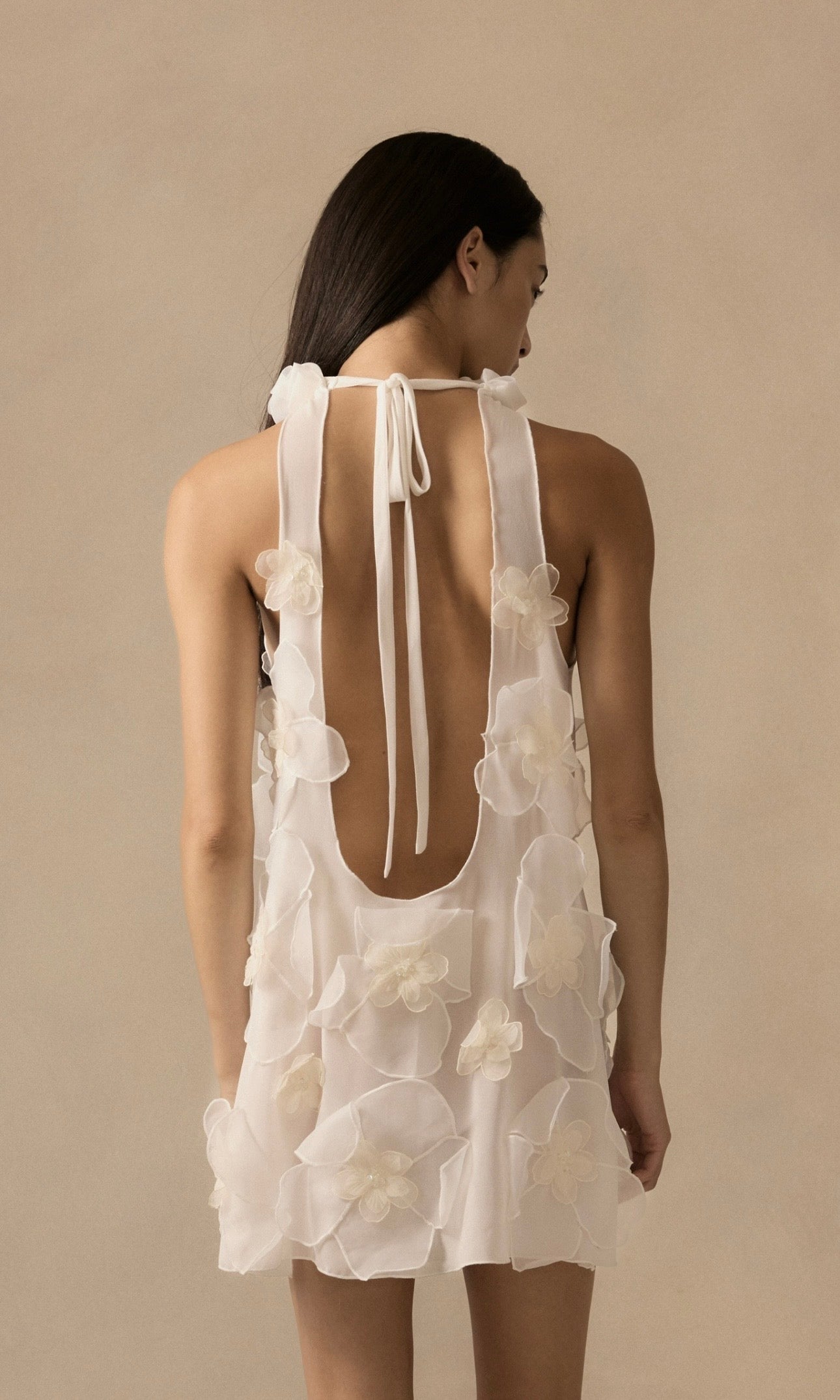 The design features an open back, exaggerated neckline and a clean mini hemline. Floral appliqué is applied by hand, adding texture and dimension to the surface of the garment.