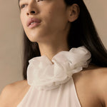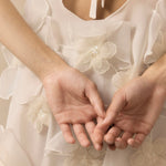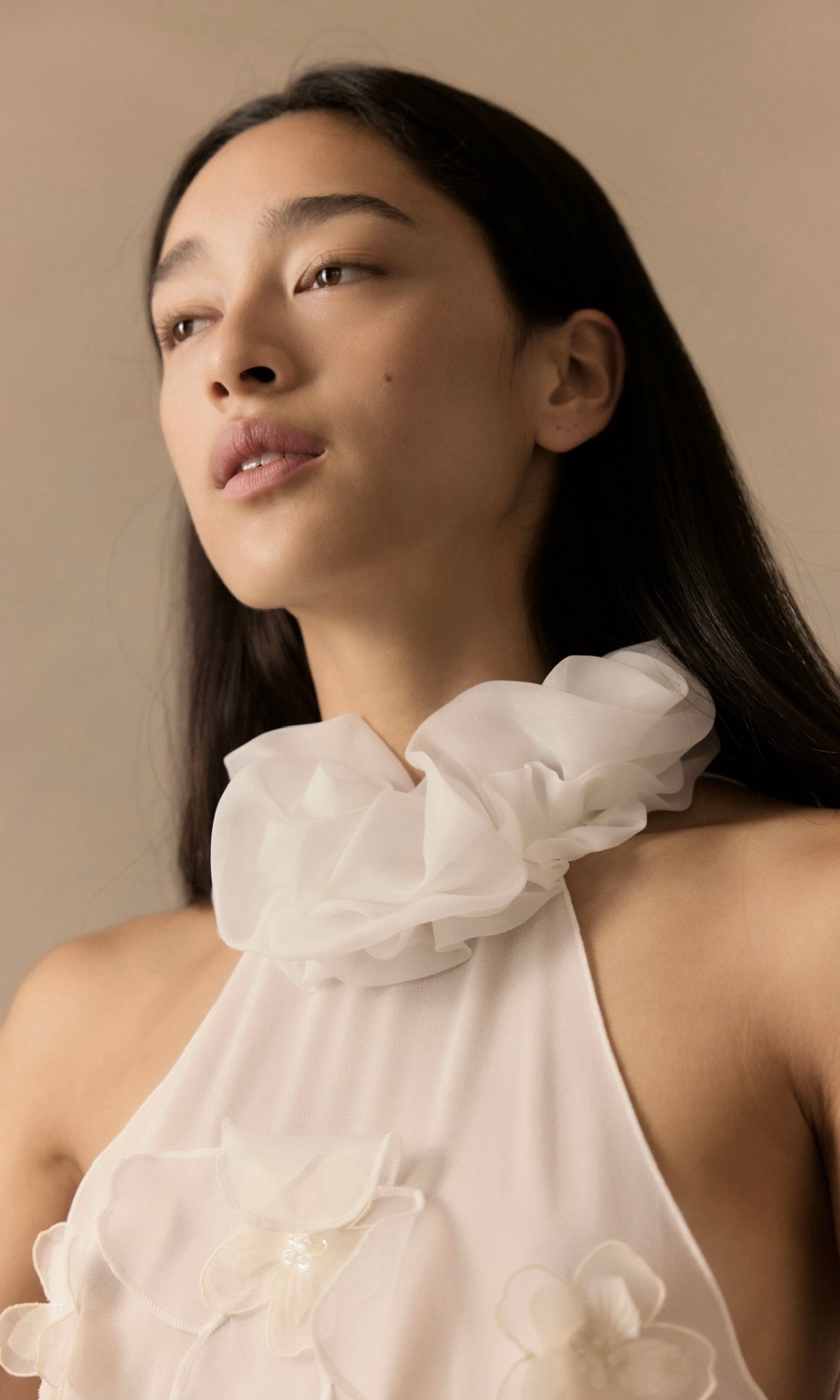 The Sofia dress is crafted in satin organza with hand-stitched floral detailing.